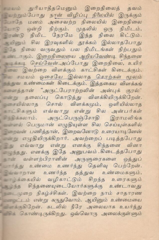 “இறைவன் பணித்தான், இறைவனோடு உரையாடினேன்” போன்ற இறையனுபவத்தை அருட்பெருஞ்சோதி இராமலிங்க வள்ளல் பெருமான் பெற்றதை நமக்கு வேதாத்திரி மகரிஷி அவர்கள், தான் அருளிய ‘அருட்பேராற்றலின் அன்புக் குரல்’ எனும் நூலின் முன்னுரையில் மூன்றாவது பக்கத்தில் எடுத்துரைக்கிறார். மேலும் தனக்கு ஏற்படும் இறையனுபவமான “ஓசையே இல்லாத சொற்கள் மூலம்” தத்துவ உண்மைகள் தனக்குக் கிடைத்ததாகவும் கூறுகிறார் வேதாத்திரி மகரிஷி அவர்கள். அன்பர்கள் அந்தப் பக்கத்தில் உள்ள அருட்செய்தினை முழுவதுமாக படித்து இன்புற வேண்டப்படுகின்றது. வாழ்க வளமுடன்!