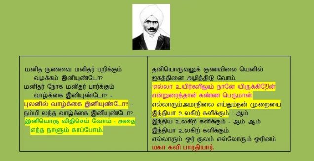 “அறிவில் அறிவாய் நிலைத்து அறம்வகுத்து அதனை வாழ்ந்து காட்டிய அத்துனை அருளாளர்களையும் நினைவு கூர்கின்ற” வேதாத்திரி மகரிஷி அவர்கள் அறிவுறுத்துகின்ற குருவணக்க யுக்தியின் படி இன்று மகாகவி பாரதியாரை நினைவு கூர்ந்து மகரிஷி அவர்களின் துணையுடனும் வழிகாட்டுதலிலும் இன்றைய சிந்தனையைத் தொடர்வோமாக! வாழ்க திருவேதாத்திரியம்! வளர்க திருவேதாத்திரியம்!!