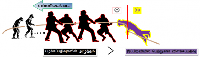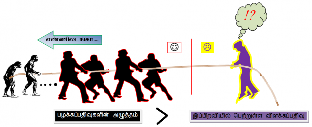 படம்-1 கருவில் திருவில்லாதவர்கள் ஒழுக்கவாழ்வு வாழ்வதில் சந்திக்கும் போராட்டத்தினை எடுத்துக் காட்டும் படம். ஒழுக்க வாழ்வு வாழ்வதில் உள்ள போராட்டத்தினை கயிறு இழுக்கும் போட்டியுடன் ஒப்பிடலாம். கயிறு இழுக்கும் போட்டி என்பதால்,ஒரு குழுதான் வெற்றி பெறமுடியும். போட்டியில் இருகுழுக்களிலும் சமமான எண்ணிக்கையில் போட்டியாளர்கள் இருந்தாலும், மிகுந்த வலிமையுடன் கயிற்றை இழுக்கும் குழுதான் வெற்றி பெறமுடியும். இரண்டு குழுவிலும் சமமான எண்ணிக்கையில் போட்டியாளர்கள் இருந்தாலும் ஒரு குழுவிற்குத்தான், அதிக வலிமையுடன் இழுக்கும் திறமை உள்ளது என்றிருக்கும் போது, பழக்கப்பதிவிற்கும், விளக்கப்பதிவிற்கும் இடையே நடக்கும் மனப்போராட்டத்தில், பழக்கப்பதிவின் குழுவில் எண்ணிலடங்கா பிறவிகளின் பதிவுகள் இருப்பதால், விளக்கப்பதிவின் குழுவில் இந்த ஒரு பிறவியின் விளக்கப்பதிவு மட்டுமே உள்ளதால் பழக்கப்பதிவு வெற்றி பெறுவது எளிதாக உள்ளது. எனவேதான் ஒழக்க வாழ்விற்கான கயிறு இழுக்கும் போட்டியில் பழக்கப்பதிவே வெற்றி பெற முடிகின்றது. காரணம் பழக்கப் பதிவு இன்று நேற்று ஏற்பட்டதன்று. தொன்றுதொட்டு, காலங்காலமாக பழக்கப்பதிவின் ஒவ்வொரு பிறவியிலும் மீ்ண்டும் மீண்டும், மீண்டும் (மீண்டும்infinite — to the power infinite)அழுத்தம் பெற்றுள்ளதால் பழக்கப்பதிவு விளக்கப்பதிவை வெற்றி கொள்கின்றது.
