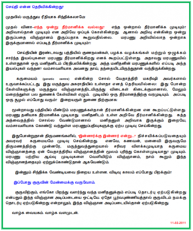 இத்தருணத்தில் 06-02-2011 அன்று வெளிவந்த தினமலா், சென்னை நாளிதழில் வந்துள்ள “நண்பர்களைத் தேர்ந்தெடுப்பதை மரபணுதான் தீர்மானிக்கின்றது” என்கின்ற செய்தியினை பகிர்ந்து கொள்வோம். அச் செய்தி வந்ததை ஒட்டி, ஆன்ம செழிப்புறு இணையதள ஆசிரியா், அன்று, அன்பர்களுடன் இ-மெயிலில் பகிர்ந்து கொண்ட சிந்தனை விருந்து இப்போது இணையதள சத்சங்க உறுப்பினர்களுடன் பகிர்ந்து கொள்ளப்படுகின்றது. வாழ்க வளமுடன்.