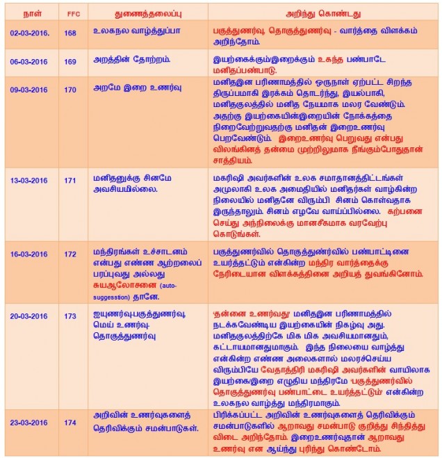 02-03-2016 லிருந்து 23-03-2016 வரை ஏழு விருந்துகளில் பகுத்துணர்வில் தொகுத்துணர்வு பண்பாட்டை உயர்த்தட்டும் என்பது பற்றி சிந்தித்து வந்தோம். இன்று அதனுடைய தொடர்ச்சியினை எட்டாவது நாளாக சிந்திக்க இருக்கிறோம். எனவே இதுவரை சிந்தித்ததை கீழே உள்ள அட்டவணையைக் கொண்டு, சுருக்கமாக நினைவு படுத்திக் கொள்வோம்.