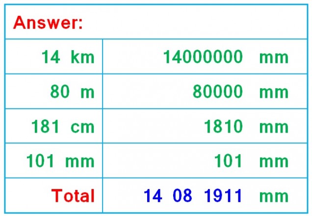 Expressing 14 km, 80 m, 181 cm, 101 mm as 14081911 mm is correct and they are one and the same. 14 km, 80 m, 181 cm, 101 mm is none other than 14081911 mm. இது தான் பகுத்துணர்வில் தொகுத்துணர்வு என்பது.