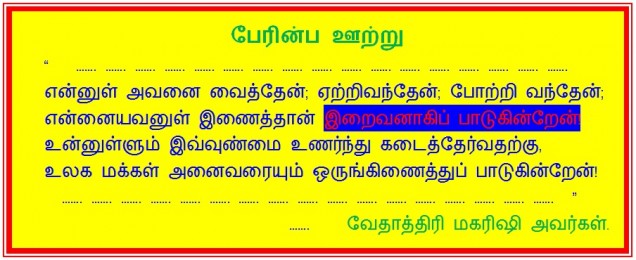 இத்தருணத்தில் ‘பேரின்ப ஊற்று’ என்கின்ற கவியில் மகரிஷி அவர்கள் அருளிய நான்கு வரிகளைக் கவனிப்போம்.