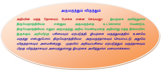 இந்த வினாவாகிய அறிவுப்பசி ஏற்படவில்லை என்றால் அறிவு மந்தமாக உள்ளது என்று பொருள். அறிவுக்கூர்மையாக இல்லை என்று பொருள். அந்த அறிவின் மந்த நோயைப் போக்க என்ன செய்வது? இயற்கை அளித்துள்ள திருவேதாத்திரியம் என்னும் அருமருந்தை உட்கொள்ள வேண்டும். திருவேதாத்திரியம் எனும் அருமருந்து. அறிய வேண்டியதை அறியாது மந்த நிலையில் இருக்கும் அறிவிற்கு பசியையும் ஏற்படுத்தி, இயற்கை மருத்துவத்தில் ‘உணவே மருந்து’ என்பதுபோல், திருவேதாத்திரியம் அருமருந்தாகவும் செயல்பட்டு, அதுவே விருந்தாகவும் அமைகின்றது. முதலில் அறிவுப்பசியை ஏற்படுத்தும் மருந்தாகவும், பிறகு விருந்தாகவும் அமைந்துள்ளது இயற்கை அளித்துள்ள மனவளக்கலை யோகா.