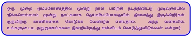 இதிலிருந்து என்ன தெரிகின்றது; தெளிவாகின்றது? நம்முடைய குருதேவர் அவர்கள், அவரைப்போன்றே, நாமும் பண்பேற்றத்தில் வெற்றி பெற்று மாக்களுக்கும், மக்களுக்கும் மனமுவந்து தொண்டாற்றும் மாமுனிவர்களாகவும் முழுமனிதர்களாகவும் ஆக வேண்டும் என்பதில் அக்கறை கொண்டிருக்கிறார் என்று ஐயமின்றி தெளிவாகின்றது.