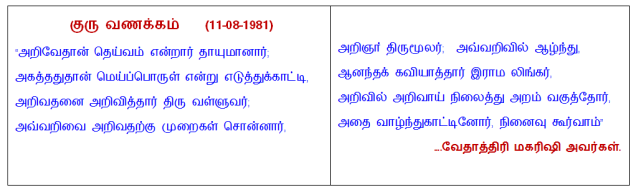 அறிஞர் திருமூலர் வாழ்ந்த காலத்தில் மகரிஷி அவர்கள் அவதரிக்கவில்லை. இருப்பினும் அறிஞர் திருமூலரை மானசீகக் குருவாக ஏற்றுக் கொண்டார் மகரிஷி அவர்கள். அவ்வாறே நாமும் ஏற்றுக் கொள்ள வேண்டும் என்பதற்காக குருவணக்கம் பாடலை அருளியுள்ளார் மகரிஷி அவர்கள். அறிஞர் திருமூலர் எழுந்தருளி, அவர் தெளிவில் தெளிவடைந்தவாறு (தெளிவு பற்றி மிகத்தெளிவாக அறிந்ததுபோல்) நமக்கும் தெளிவுபடுத்தட்டும். தெளிவினை அறிஞர் திருமூலர் வாய்மொழியாகவே அறிந்துகொள்வோம்.