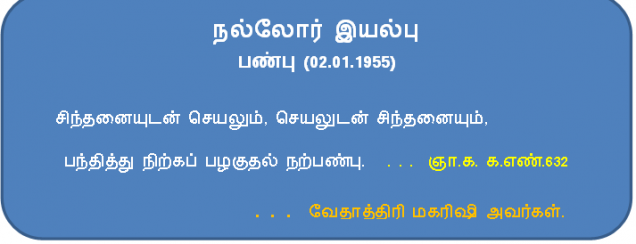 சிந்தனையுடன் செயலும், செயலுடன் சிந்தனையும் ஒன்றுக்கொண்டு பிரியாது இணைந்திருக்க (பந்தித்து நிற்க-உறவு கொண்டிருக்க வேண்டும்). இது நல்லோர் இயல்பு என்றும், பண்பு என்றும் கூறுகிறார் சிந்தனைச் செல்வரும், மற்றவர்களையும் சிந்தனைச் செல்வர்களாக்கி, மனிதனை தெய்வ நிலைக்கு உயர்வதற்கு வழிகாட்டிக் கொண்டிருக்கும் சிந்தனைச் சிற்பியுமான வேதாத்திரி மகரிஷி அவர்கள். நல்லோர் இயல்பு பற்றி அவரே மொழிவதனைக் கேட்போம்.