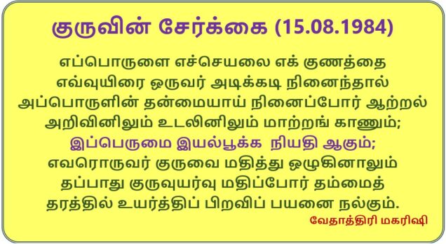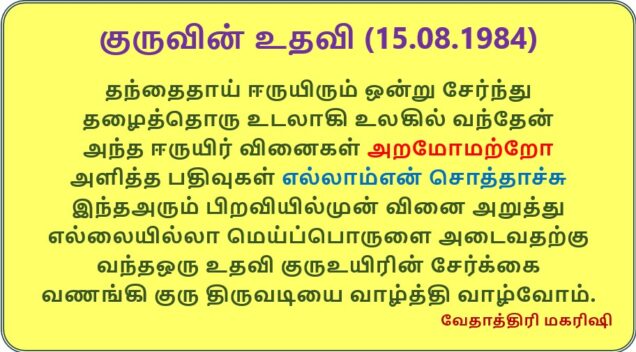 இத்தருணத்தில் புனர்ஜென்மம் எடுத்த பிறகு குரு எவ்வாறு உதவுகிறார் என்பதனை மகரிஷி அவர்களின் வாய்மொழியின் வாயிலாகவே இச்சிந்தனையின் தொடக்கத்தில் பாடிய அவரது கவியின் வாயிலாகவே அறிந்து கொண்டோம். இதுவரை பிறந்த நாள் கொண்டாடுவதன் நோக்கத்தை நினைவு படுத்திக்கொண்டோம். அந்நோக்கத்திற்கு பொருத்தமாக இச்சத்சங்கத்தில் சிந்திக்க அவர் மொழிந்துள்ள வார்த்தையையே எடுத்துக் கொள்வோம்.