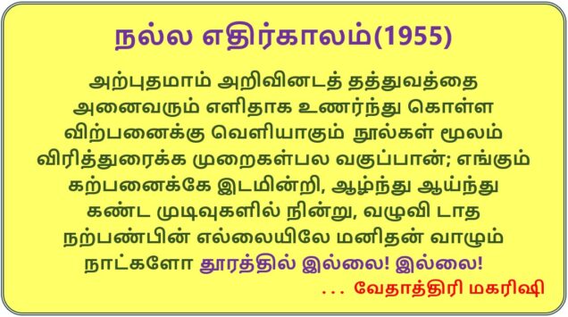 அறிவின் அறிவியல் தோற்றத்தின் விளைவு நல்ல எதிர்காலம் உலகிற்கு வந்துவிட்டது. வருங்காலம் உணரும் ஞானத்தால் ‘நல்ல எதிர்காலம் உலகிற்கு வந்து விட்டது’ என மகரிஷி அவர்கள் கூறுவதனை, அவர் எண்ண ஓட்டத்துடன் இணைந்துவிட்ட நாமும், நல்ல எதிர்காலம் உலகிற்கு காத்துக் கொண்டிருக்கின்றது என உறுதிபடுத்திய பிறகு, பயனாளியராக இருக்கும் நாம் மனப்பூர்வமாக, இதயப்பூர்வமாக மகிழ்ச்சியோடு அவர் கூறும் உண்மையை ‘ஆம்!’ என ஆமோதிக்கிறோம்.