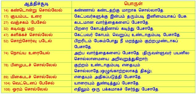 அவ்வைத்தாய் எவ்வாறு சொற்களைப் பயன்படுத்த வேண்டும் என்று ஆத்திச்சூடியில் அமுதமொழிகளால் அறிவுரைகளை கூறுவதனை நினைவு கூர்வோம்.